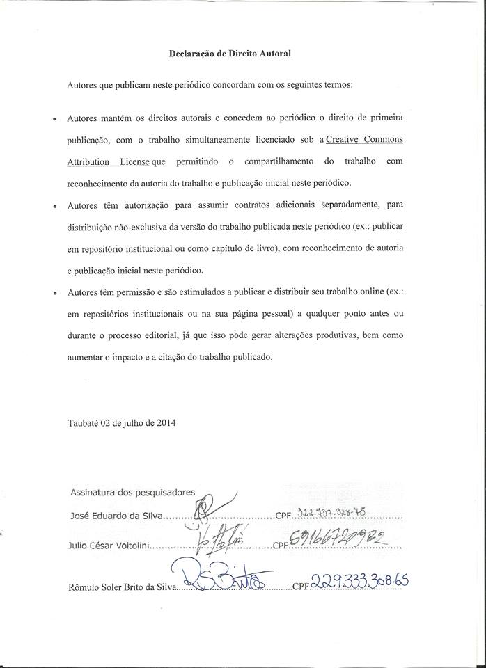 - Autores têm autorização para assumir contratos adicionais separadamente, para distribuição não-exclusiva da versão do trabalho publicada neste periódico (ex.: publicar em repositório institucional ou como capítulo de livro), com reconhecimento de autoria e publicação inicial neste periódico.